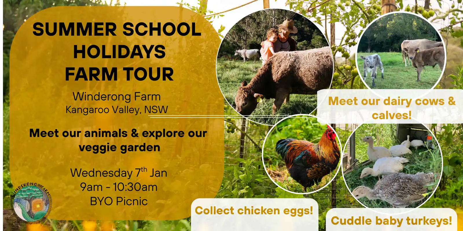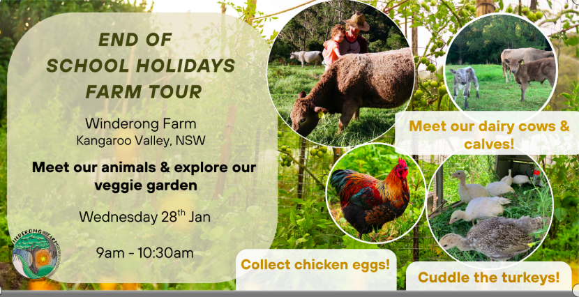 Come meet and interact with the animals at Winderong Farm. Learn how we milk our Jersey cows and about calf-at-foot dairying with little Minnie and Mumma Mouse.Gently cuddle our new baby turkeys before they get too big. They grow so fast! See how we use...